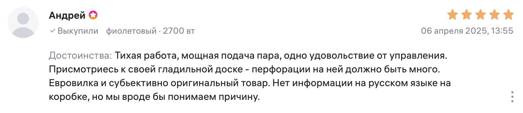 Резервуар 1,8 л поддерживает долив воды, металлокерамическая подошва устойчива к износу, а экорежим экономит электроэнергию. Вес 3,34 кг облегчает хранение и переноску. Модель оптимальна для регулярной, но умеренной нагрузки. На плотных тканях процесс займёт чуть больше времени, чем у лидеров рейтинга.