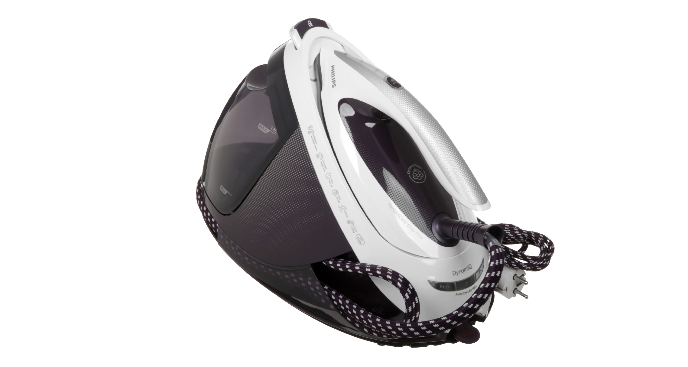 Philips GC9660/30 — это мощный парогенератор в ярком фиолетовом цвете с производительностью 2700 Вт и давлением 7.5 бар, оснащенный интеллектуальной системой глажения. Благодаря технологии OptimalTEMP и датчику движения DynamiQ устройство автоматически регулирует подачу пара до 520 граммов в минуту и температуру, полностью исключая риск прожечь ткань. Модель имеет прочную титановую подошву T-ionicGlide для легкого скольжения, съемный резервуар на 1.8 литра для длительной работы и функцию вертикального отпаривания с паровым носиком.