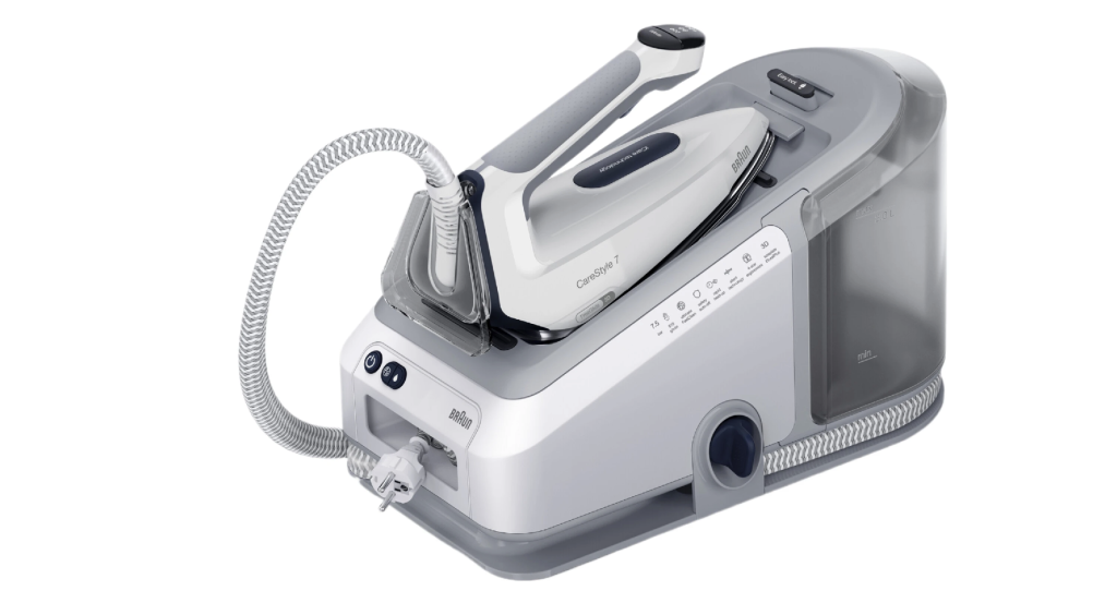 Следующий участник Braun CareStyle 7 IS7262GY догоняет по характеристикам лидера рейтинга. Мощность 2700 Вт, давление 7,5 бар и паровой удар 510 г/мин, что делает его надёжным помощником для повседневной глажки. Резервуар 2 л позволяет гладить долго без перерыва, а авторежимы, турбо и эко подстраиваются под ткань и объём белья.