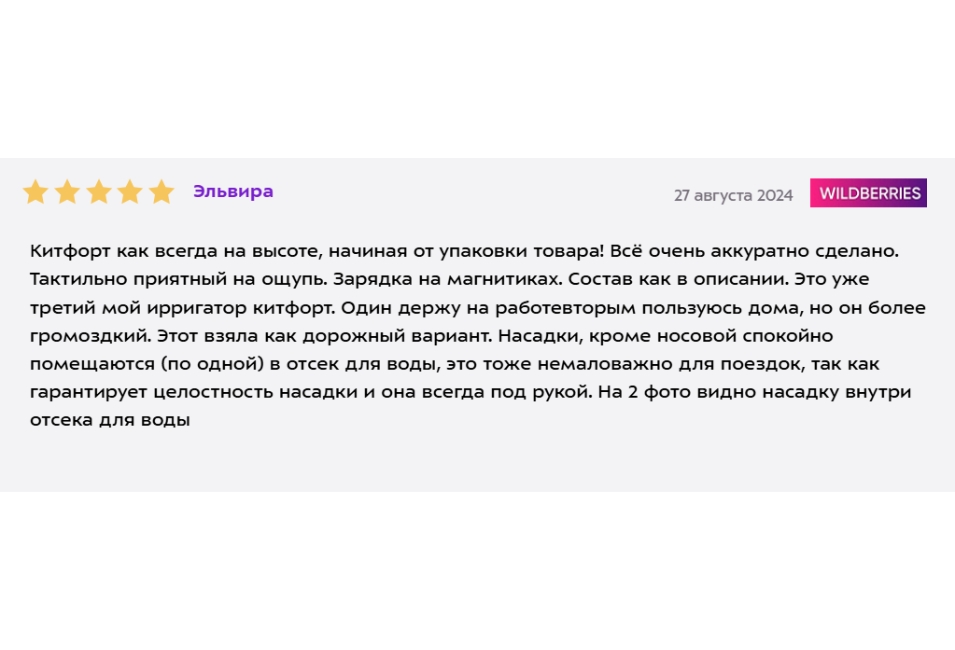 Насадки, несмотря на свою внешнюю хрупкость, отличаются высокой прочностью и долговечностью. Особое внимание стоит уделить продолжительности работы устройства от аккумулятора. Согласно отзывам пользователей, одного заряда хватает на более чем месяц регулярного использования. Объем резервуара для воды — 200 мл.